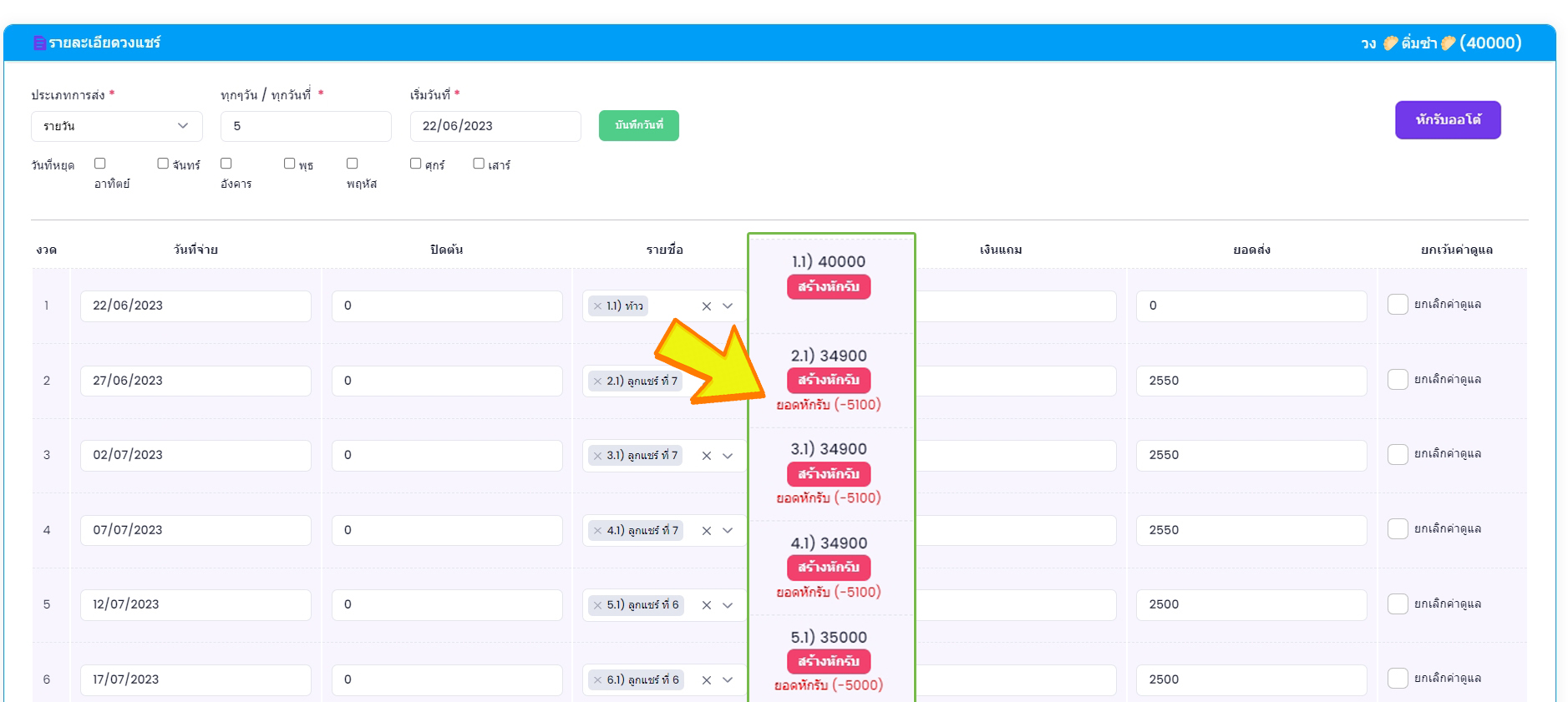หลังสร้างวงเสร็จในกรณีที่เรา เดินวงนั้นมาซักพักแล้ว ทางระบบเรามีปุ๋มคอยซัพพอร์ตลูกค้าที่ต้องการทำหักรับตั้งแต่เริ่มต้นจนถึงงวดปัจจุบัน โดยกดปุ๋ม "หักรับออโต้"